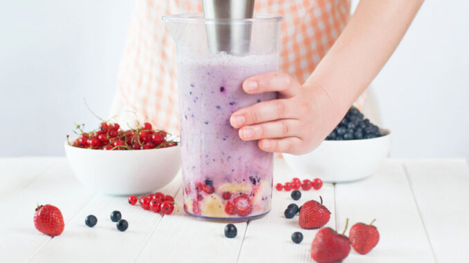 Ein Smoothie mit einem Stabmixer ist im Handumdrehen zubereitet. Geben Sie alle Zutaten in ein hohes Glas, aber füllen Sie es nicht mehr als zwei Drittel voll.