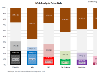 Pressemitteilung – Wenn am nächsten Sonntag Bundestagswahl wäre, würden unverändert 26 Prozent der Wahlberechtigten CDU/CSU wählen. Die AfD bleibt mit 21 Prozent weiterhin zweitstärkste politische Kraft im Land, verliert nach dem Höhenflug der letzten Monate jedoch zum ersten Mal seit März wieder leicht an Zuspruch (-1). Für die SPD würden sich wie schon im Vormonat 17 Prozent der Wahlberechtigten entscheiden. Die Grünen verlieren leicht in der Wählergunst und kommen auf 14 Prozent (-1). Die FDP bleibt konstant bei 8 Prozent der Stimmen, die Linkspartei verbessert sich leicht und liegt nun wieder bei 6 Prozent (+1). Die sonstigen Parteien können 8 Prozent (+1) der Stimmen auf sich vereinen.