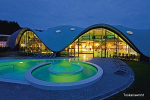 Heute sind Kurbetrieb und die Gesundheit ein echter Standortfaktor in Bad Orb. Drei Heilquellen sprudeln hier, die Philippsquelle, die Ludwigsquelle und die Martinusquelle – und jüngst wurde noch eine vierte entdeckt und auf den Namen Leopoldsquelle getauft; das neue Quellenhaus wird gerade gebaut. Gleich nach unserer Ankunft geht es in die 2010 eröffnete Toskana-Therme. Der Bau ist architektonisch ein Leckerbissen: Nach Plänen des Fuldaer Architekten Andreas Ollertz als eine freitragende Holzkonstruktion errichtet, bietet die Therme sechs Wasserbecken, die zum Teil mit 32 Grad warmer Sole gespeist werden, eine große Saunalandschaft, 800 Quadratmeter Wasserfläche, Unterwassermassageliegen, einen Strömungskanal, Ayurveda-Behandlungen, Massagen, einen „Liquid-Sound-Tempel“, Unterwasserscheinwerfer und Lichteffekte – es ist gerade bei Dunkelheit schön, den Bau von außen zu betrachten und von innen zu erleben. Die Therme ist überschaubar groß und gerade das gefällt uns ausgesprochen gut.