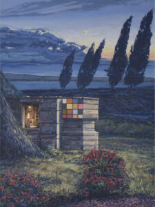den Bildraum, hinein in rätselhaft-unwirklich, teils bedrohlich wirkenden Bildwelten. Die einzelnen Bildelement, wie die Figuren, die Gebäude oder die Räume sind dabei zufällig in den Medien oder in privaten Aufnahmen vorgefundene Versatzstücke oder der Fantasie des Künstlers entsprungene Szenerien, die er zu einem Gesamten verbindet und so mystisch-theatrale Kulissen entstehen lässt.