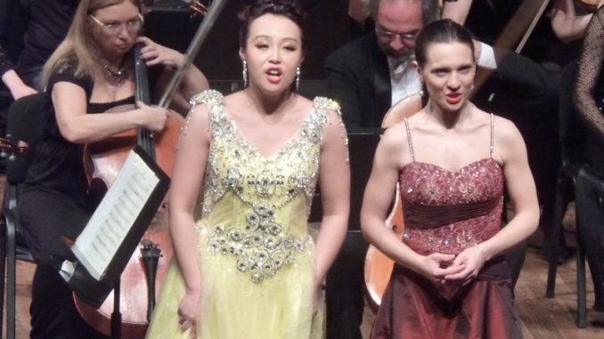 Die Neujahrsmatinee 2016 war zeitlich nicht viel kürzer als ihr Vorgänger am Silvesterabend, zwei Stündchen mit jeweils einer Zugabe, der „Barcarole“ aus „Hoffmanns Erzählungen“ zum Jahresende („Liebesnacht, o Liebesnacht…!“, s. Foto mit Junhua Hao und Paola Leggeri), am 1. Jänner aber einem absoluten Chor-Hit aus Rossinis „L` italiana in Algeri“, der Oper wohlgemerkt, die auf dem laufenden Tiroler Winter-Festspiel-Programm steht. Dieses Werk studierte Maestro Gustav Kuhn ein, der auch das Neujahrskonzert als Dirigent bestritt, federnd, feurig, frisch, flott, fröhlich, auch a bisserl frech, immer aber fordernd – vor allem sein ihm ganz ergebenes, erlesenes und von seiner festlich-guten Laune angestecktes Orchester samt Chorakademie der Tiroler Festspiele Erl und Sängerinnen und Sängern der Accademia di Montegral.