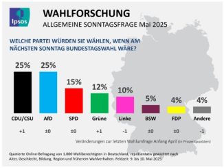 Nach der Wahl von Friedrich Merz zum Bundeskanzler hat sich die politische Stimmung im Land kaum verändert. Im aktuellen Sonntagstrend des Markt- und Meinungsforschungsinstituts Ipsos gewinnen CDU und CSU einen Prozentpunkt hinzu und kommen auf 25 Prozent. […]