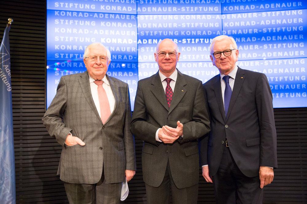 Amtsübergabe im Vorsitz der Konrad-Adenauer-Stiftung von Hans-Gert Pöttering an Norbert Lammert. Berlin, 18. Januar 2018. V.l.n.r.: Bernhard Vogel, Norbert Kammert, Hans-Gert Pöttering. Quelle KAS