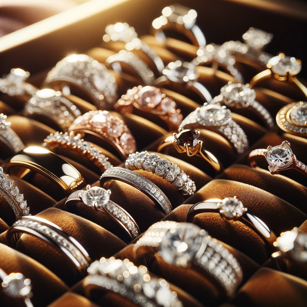 Eine Nahaufnahme verschiedener Trauringe auf einem luxuriösen Samthintergrund, die die Vielfalt und Schönheit der verfügbaren Ringe zeigt und die Wichtigkeit der persönlichen Auswahl betont.