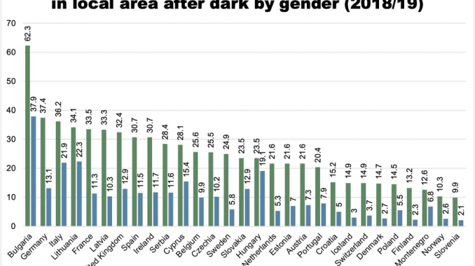 In Bulgarien fühlen sich erschütternde 62 % der weiblichen Befragten unsicher oder sehr unsicher. Der Wert in Bulgarien ist auch der höchste in Europa für männliche Befragte, von denen 38 % angaben, dass sie sich nicht sicher fühlen würden – aber die meisten Männer dort geben immer noch an, sich mit deutlichem Abstand sicherer zu fühlen als Frauen.