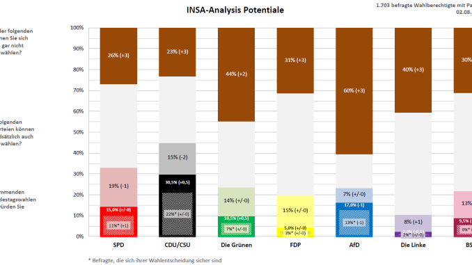Bei den potentiellen Wählern kann sowohl die Linke als auch das BSW einen Prozentpunkt zulegen. Die SPD verliert hier hingegen einen und die Union zwei Prozentpunkte. Die Potentiale der restlichen Parteien bleiben konstant.