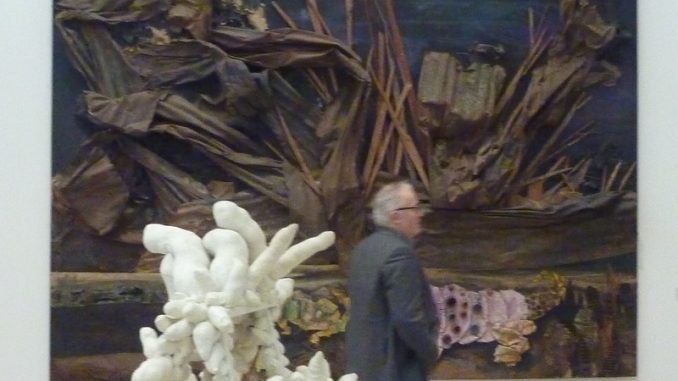Der Argentinier Antonio Berni ist nicht die einzige von 216 Künstlerpersönlichkeiten aus der weltweit ins Auge gefassten unmittelbaren Nachkriegszeit, deren Werke das Münchner „Haus der Kunst“ derzeit zeigt, die Straßenmüll für sein bildnerisches Schaffen verwendet. In dem großen Material-Gemälde „Die stürmische Pampa“ von 1963 sind es Holzstücke, scharfkantige Rostbleche mit Farbresten, allerlei Altmetall, dazu Spanplatten, Plastikknöpfe und Pappe. Ein bunt schillerndes Ungeheuer, das einem trägen Krokodil ähnelt, wälzt sich in einer chaotischen, zugemüllten Strandgegend, wo es „seine Beute“, wie erklärt wird, „durch die post-apokalyptische Szenerie verfolgt“. Auf einer riesigen Müllhalde liegt für den genauen Betrachter die Freiheitsstatue auf dem Boden. Die Großstadt, egal an welche man dabei denkt, liegt in Schutt und Asche. Aus. Zerstört. Eine End-Situation. Rostige Metalltrümmer schieben sich bedrohlich über einen dunkelblauen Himmel, der keiner mehr ist.