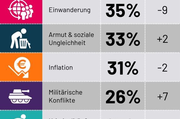 Für 35 Prozent der Deutschen zählt die Migration zu den drei größten persönlichen Sorgen; damit nimmt die Zuwanderung weiterhin den ersten Platz im Sorgenbarometer ein, verliert aber im Vergleich zum Vormonat 9 Prozentpunkte. An zweiter Stelle steht das Thema Armut und soziale Ungleichheit (33 %), gefolgt von der Inflation (31 %).