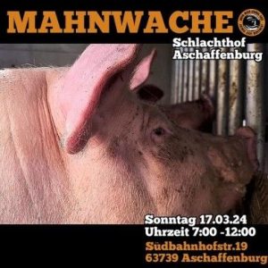Am Sonntag, den 17.03.2024 von 7:00 -12:00 Uhr, werden wir am Schlachthof Aschaffenburg unsere 35. Mahnwache abhalten und den Tieren das letzte Geleit geben. Wer sich uns anschließen möchte, ist herzlich dazu eingeladen. Wir werden vor Ort mit den Auflagen, die uns das Ordnungsamt Aschaffenburg auferlegt hat, vertraut machen.