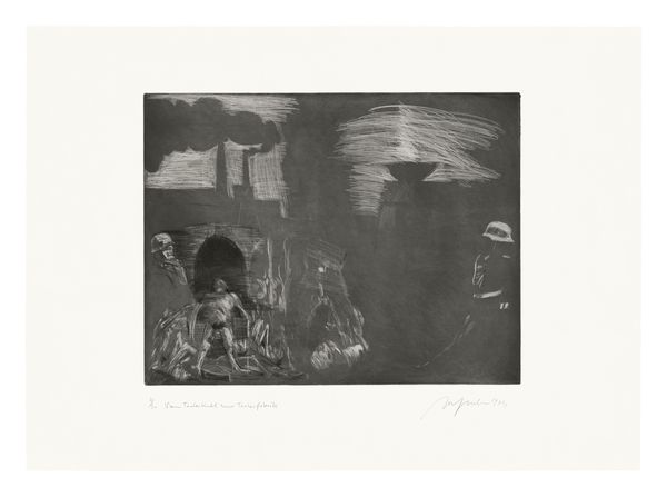 Alfred Hrdlicka, Wie ein Totentanz – Die Ereignisse des 20. Juli 1944, Blatt 28, Vom Todeskult zur Todesfabrik, 1974 | 500 x 651 mm, Aquatinta geschabt, Kaltnadel und Wiegemesser auf Kupfer | © Alfred Hrdlicka-Archiv, Wien