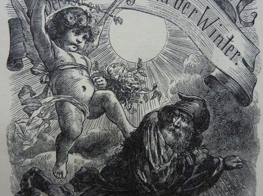*) „Der Frühling und der Winter“, geschmückt mit einem Holzschnitt von E. Singer (Foto: Hans Gärtner), aus: „Für Müh` und Fleiss!“, Fabeln, Erzählungen und Rätsel von P. Benndorf, Leipzig (Verlag Abel und Müller), 5. Auflage o. J. (um 1900), S. 177 f.: