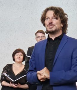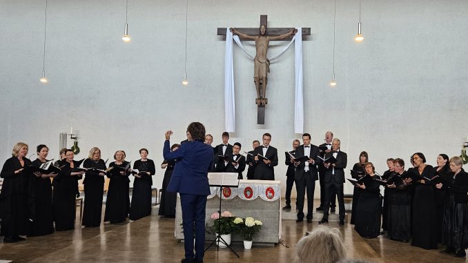 André Philipp Gold brachte seinen 2017 gegründeten semiprofessionellen, dreißig Frau&Mann starken Kammerchor mit der seinen Familiennamen und seine Liebe zum Gesang verbindenden Firma „Cantus Aurumque“ mit und reihte ihn, schwarz gekleidet und die Stimmbänder bestens präpariert, um den nach-österlich geschmückten Altar, den Gekreuzigten mit weißem Grabtuch für alle sichtbar im Background. Dass die Sängerinnen und Sänger, abgesehen von wenigen leichten Intonationsschwächen, ihren Part – die Vereins-Chefin ins Blickfeld gerückt – sehr gut meisterten, war, angesichts so manchen großen Erfolgs im In- und nahen Ausland, nicht anders zu erwarten.