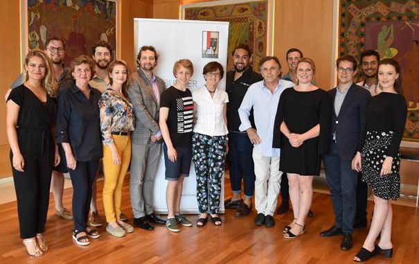 Die Teilnehmer des Young Singers Projects 2019 zusammen mit Leiterin Evamaria Wieser und dem Direktorium der Salzburger Festspiele – Helga Rabl-Stadler, Markus Hinterhäuser und Lukas Crepaz. Foto: SF/Anne Zeuner